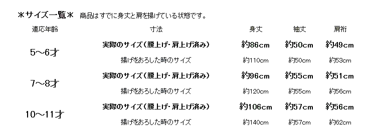 【5〜6歳向け】 ◆実際の寸法◆身丈:約86cm 肩裄:約49cm ◆揚げ前寸法◆身丈:110cm 袖丈:50cm 肩裄:53cm (※商品は既に揚げをしております。