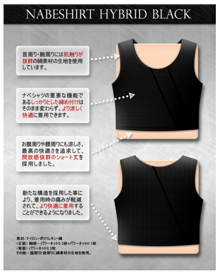 商品名 ナベシャツ ハイブリッド ブラック(2枚セット) 商品詳細 最高の機能と最高の着心地がひとつに!新感覚ナベシャツ!納得の機能と着心地! 胸部にスタンダードタイプ・ハードタイプ2種類のパワーネットを使用する事で、しっかりと締め付けつつも、より快適な着心地を両立しました。