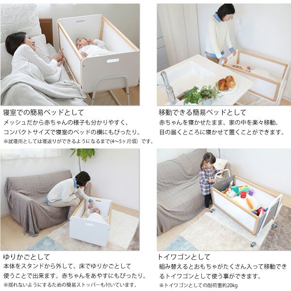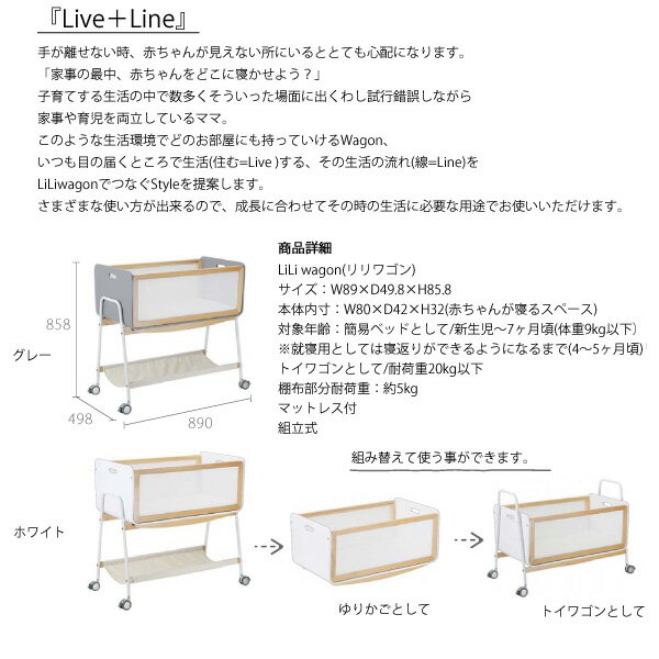 商品説明 サイズ( cm ) W89×D49.8×H85.8 本体内寸:W80×D42×H32 仕 様 ・本体重量:約13kg ・対象年齢:簡易ベッドとして/新生児〜7ヶ月頃(体重9kg以下) ※就寝用として寝返りができるようになるまで(4〜5ヶ月頃) ■耐荷重 ・トイワゴンとして:耐荷重20kg以下 ・棚布部分耐荷重:約5kg ・マットレス付 ・組立て式 送料 送料無料 ただし、北海道、沖縄、離島は追加料金がかかります。