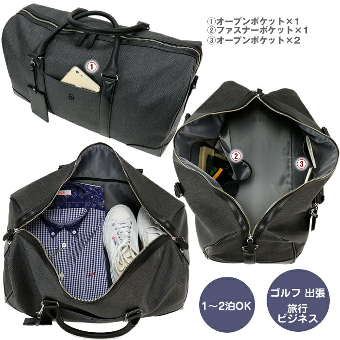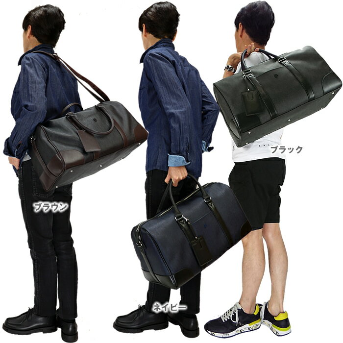 カラー ブラック、ネイビー、ブラウン 素 材 本体部分/PVC本体以外(付属品など)/スプリットレザー サイズ W48・H28・D21cm 生産国 made in china 仕様内容 1〜2泊OKのボストンバッグ。